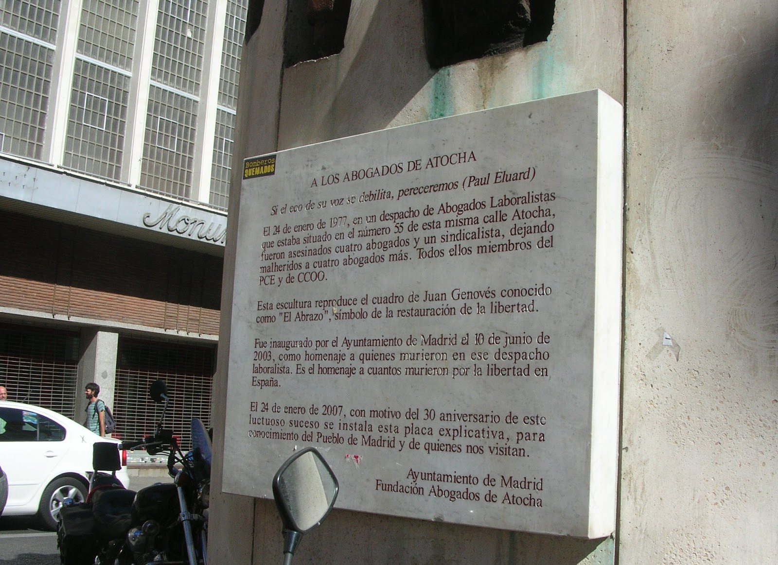 Tal como refere a placa, a 24 de janeiro de 1977, durante uma reunião de advogados laborais e sindicais que teve lugar no nº 55 da calle de Atocha, quatro advogados e um administrativo foram assassinados a tiro, enquanto outras quatro pessoas ficaram gravemente feridas. Todos eles eram membros do PCE e do CCOO, partidos ainda não legalizados - que, curiosamente, o viriam a ser poucos meses depois - e o ataque foi perpetrado por conhecidos elementos da extrema direita, que nem se deram ao trabalho de fugir de Madrid, confiantes que estavam das suas "boas ligações" ao regime franquista. É salutar manter essas memórias vivas, independentemente da ideologia das fações extremistas ser de esquerda ou de direita. Assassinos são apenas isso, por muito que se mascarem!